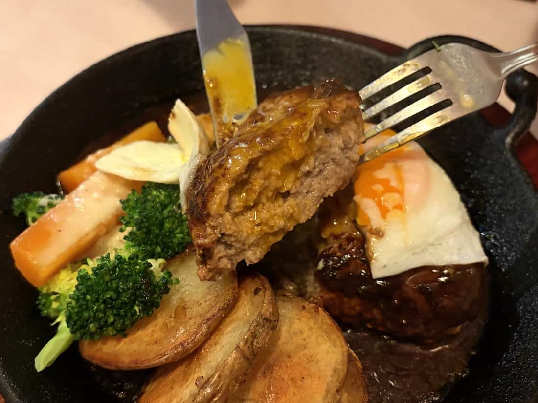 期待通りの美味しさ。ジューシーなハンバーグと濃厚なデミグラスソースのテッパンの組み合わせ。途中から黄身を割ってまろやかさもプラスして味変も楽しめます。