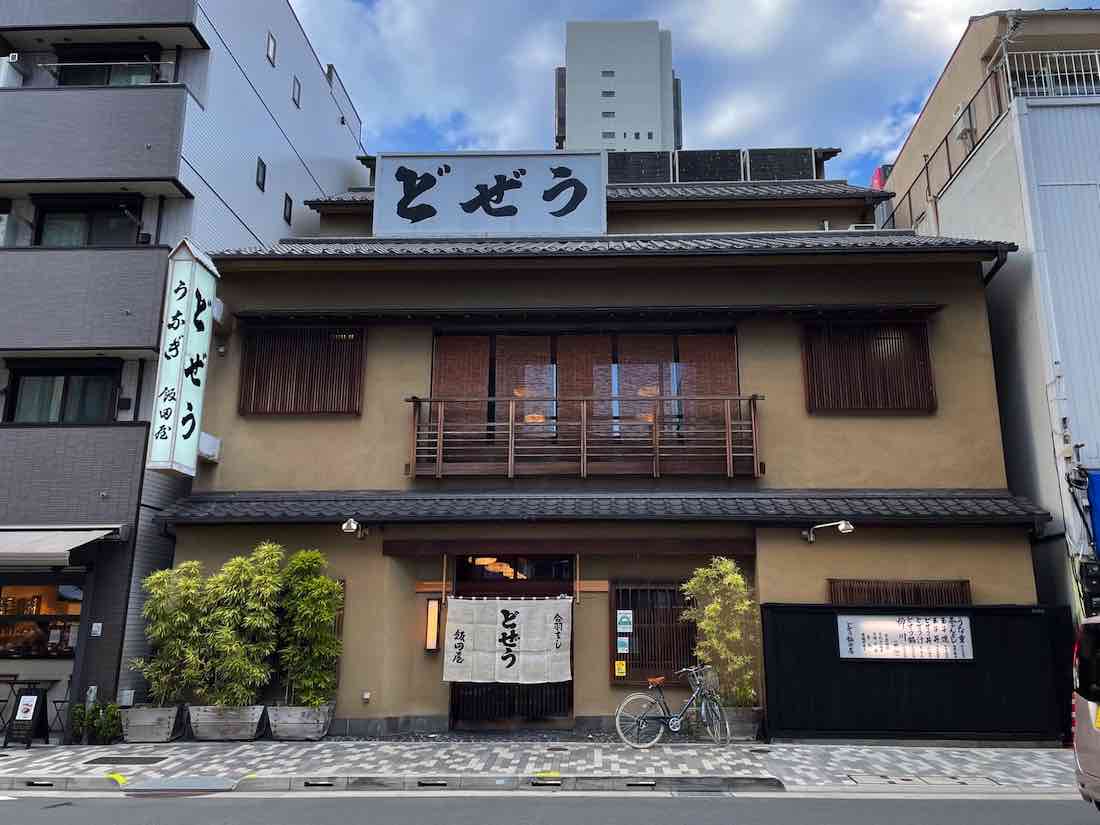 こちらが外観。「どぜう」と極太の毛筆で書かれた大きな看板が印象的。歴史を感じる立派な佇まい。