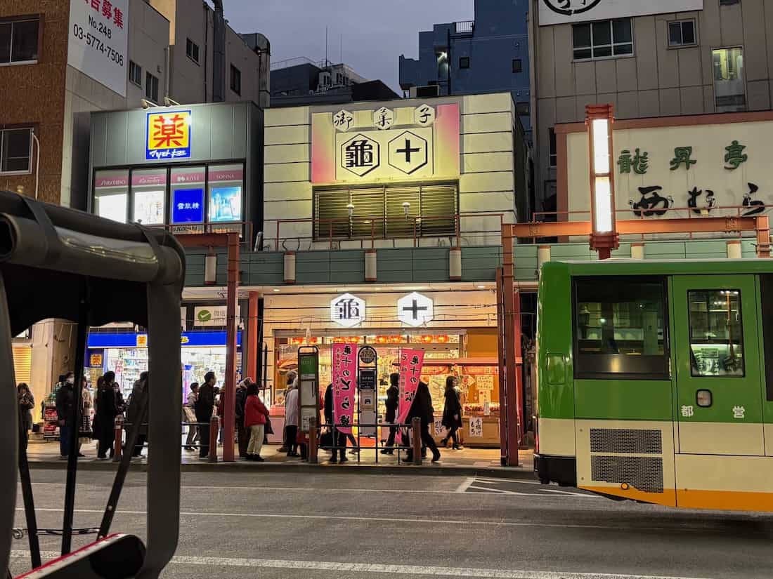 空いているように見えたのは入場制限をしていたから。雷門通り沿いある人の列は、亀十への入店を待つ行列。スタッフが誘導して列を作っています。
