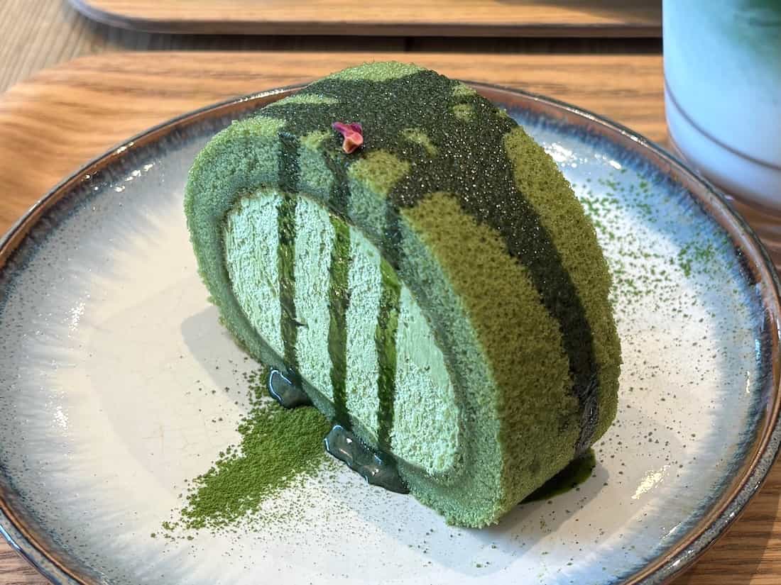 抹茶ロールケーキはしっかりした甘さあり。なので、甘さのない抹茶ティーと合わせるとスッキリして相性がいい。
