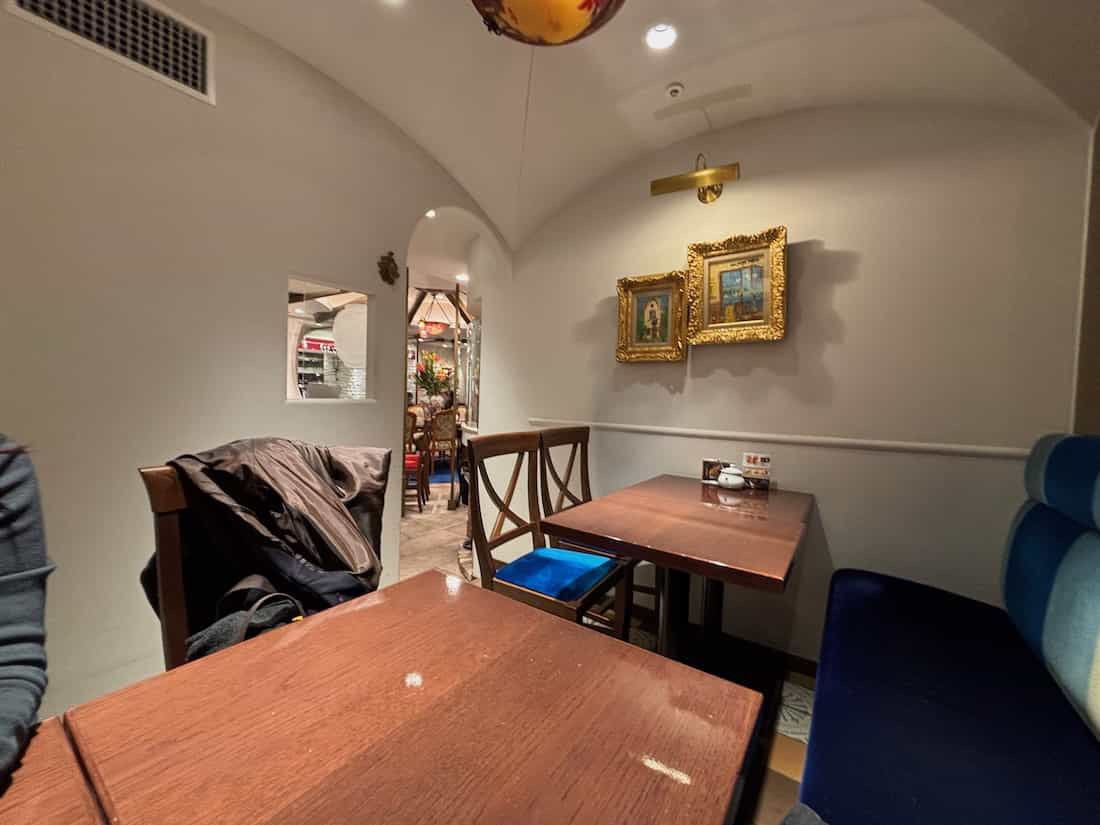 店内は白壁を基調として本物のガレランプ、絵画、綺麗な生花などが飾られています。