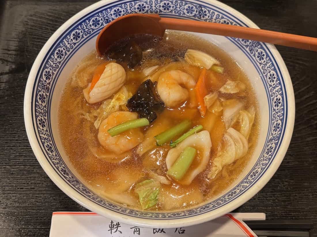 野菜とエビ・イカなどの海鮮素材もたっぷり。スープは優しいコクあり。とろみもあるので麺にしっかり絡みついてきます。