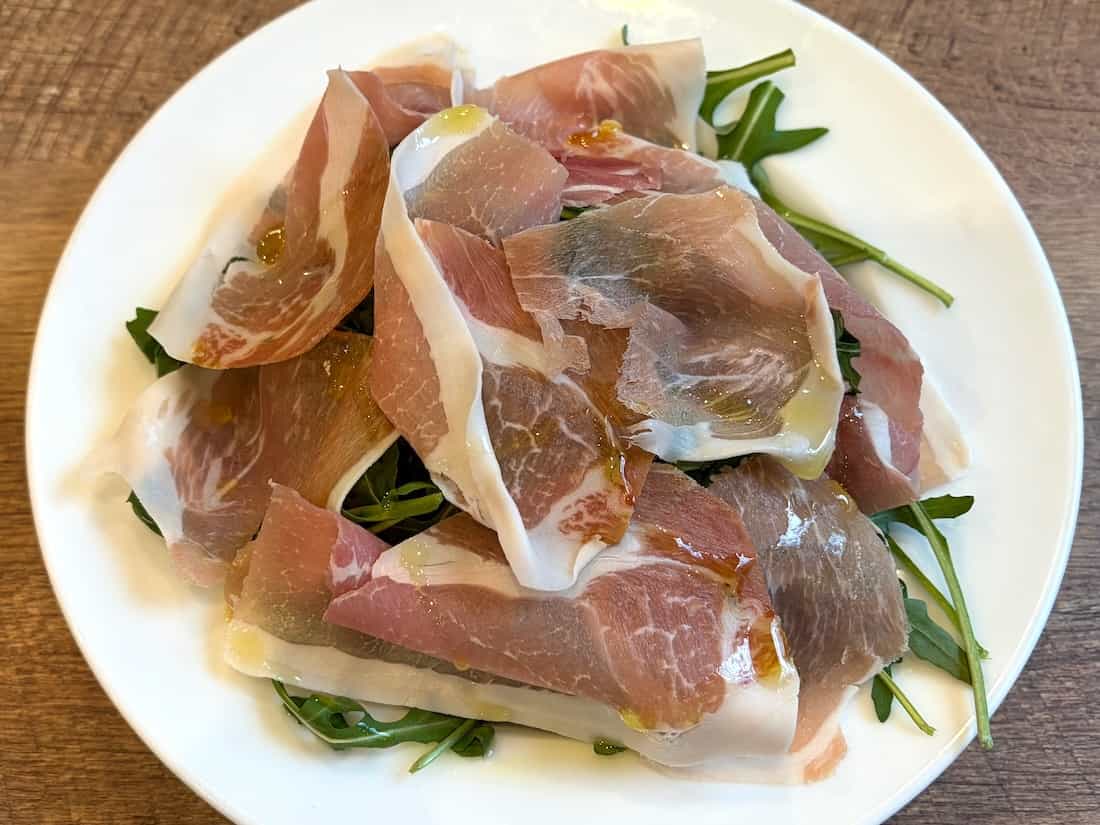シャキシャキのルッコラがたっぷり。生ハムの塩気と一緒に。