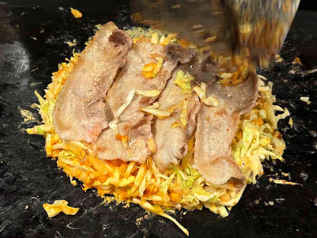明太子もちもんじゃと同様に、こちらも具材のインパクトが凄い。美味しそうな脂身を蓄えた大きな豚肉がたっぷり。