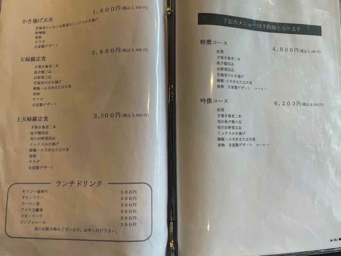 ランチメニューは天ばらセット、天茶セットが1320円。天麩羅定食は3080円。上天麩羅定食は3850円。