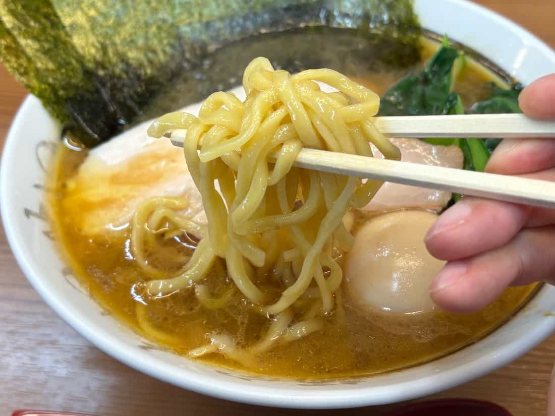 麺は酒井製麺。横浜家系ラーメンの総本山「吉村家」直系店を中心に採用されている麺。プリプリツルツル。