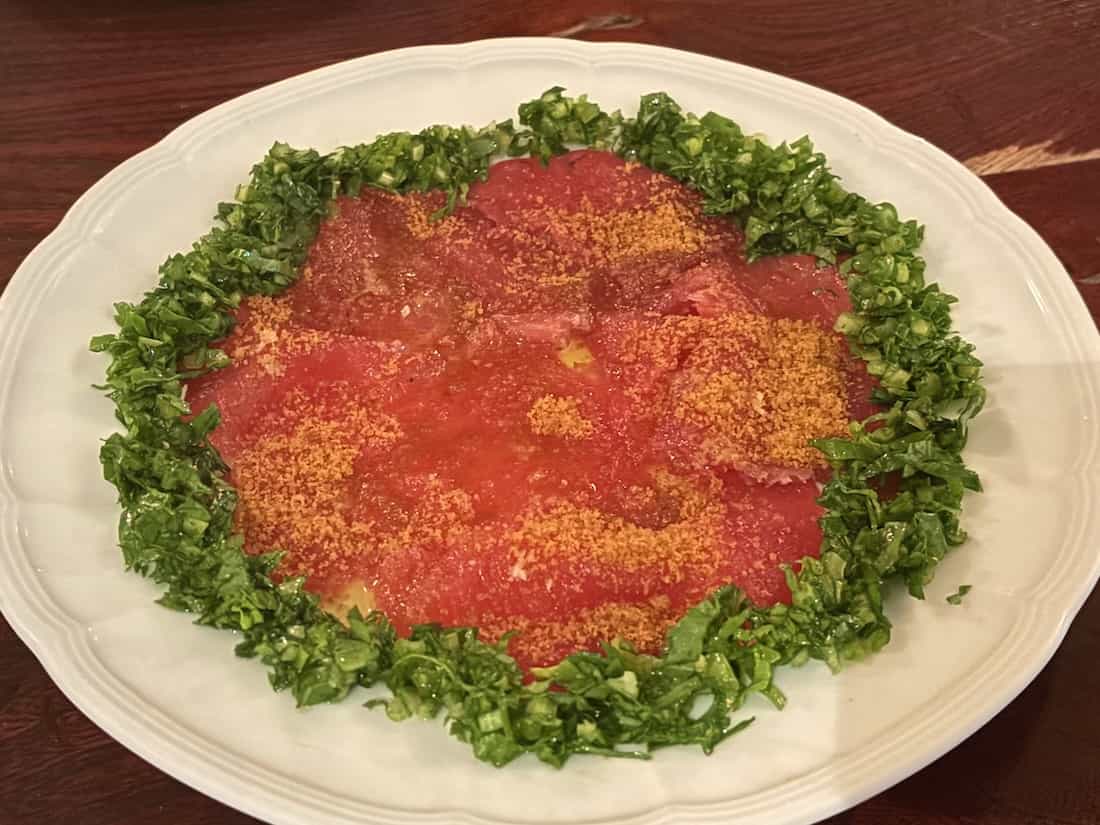 鰹(カツオ)とルッコラのカルパッチョ・カラスミがけ2200円。