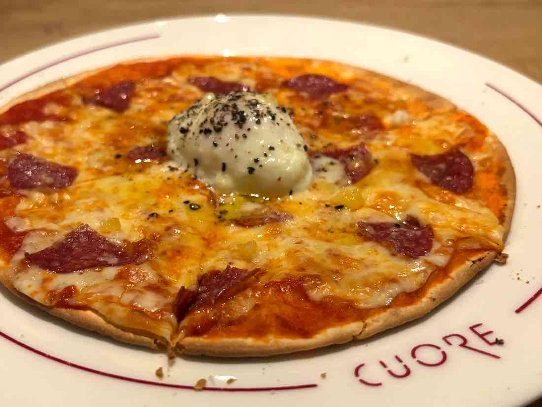 ピザの中心にもっこりと仕上げた半熟卵がのっています。