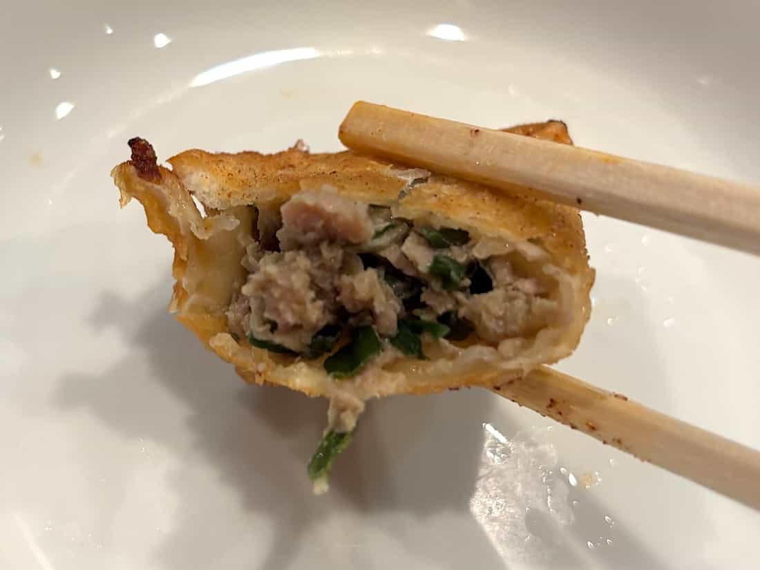 餡の肉は弾力、肉感が強い仕上がりで食べ応え抜群。ひとくち食べると肉汁が溢れ出てきます。