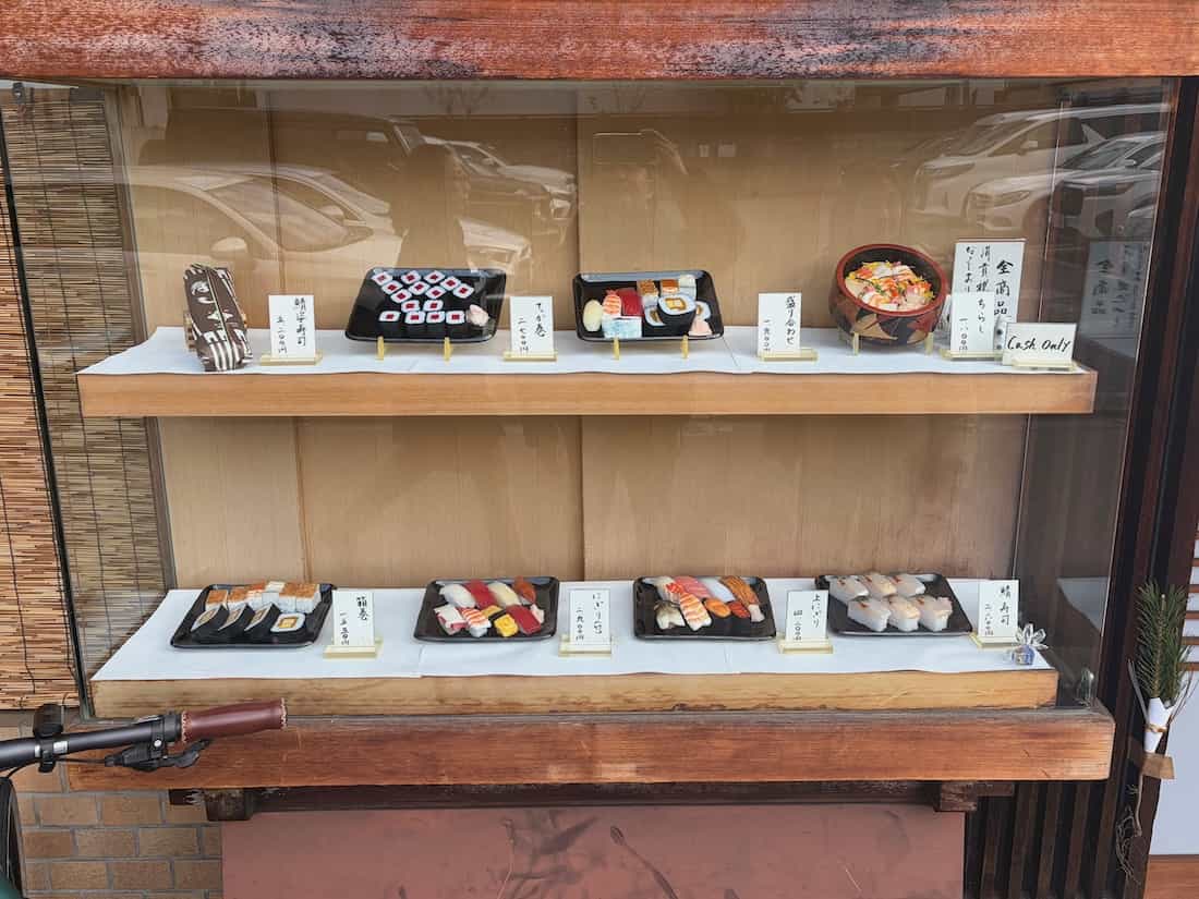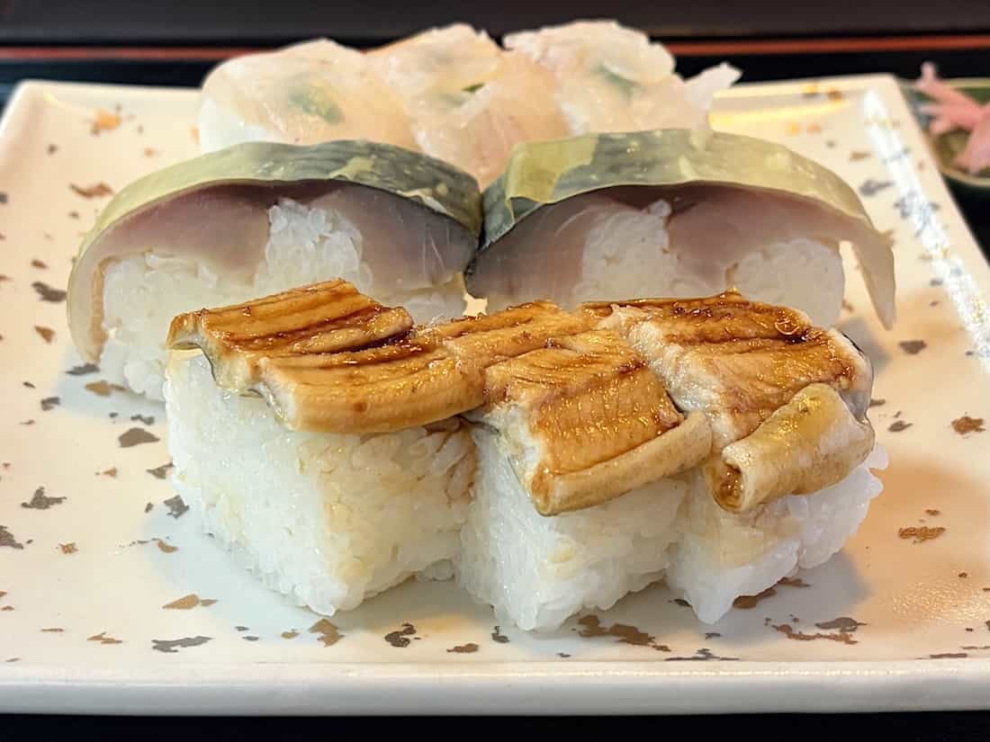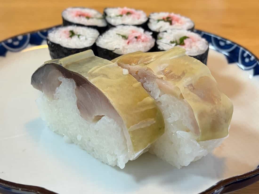 鯖寿司2切900円、うぐいす巻(梅肉・青じそ)1本450円。