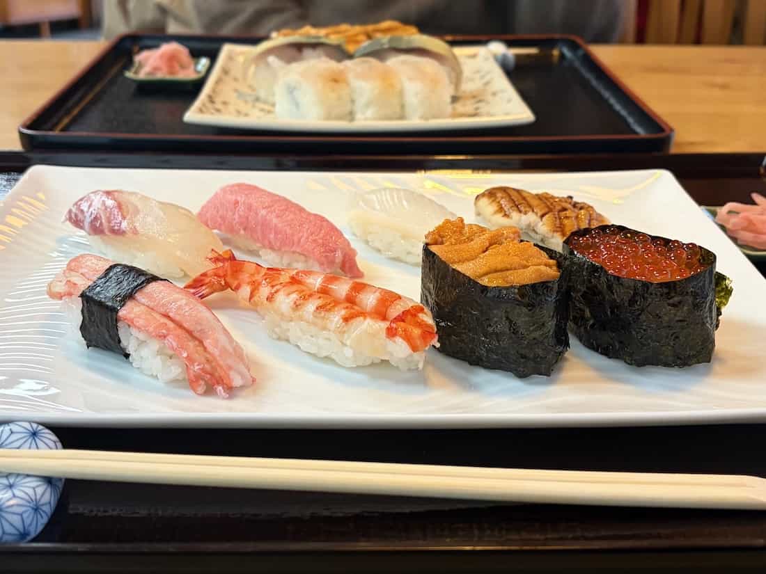 1つ1つ間を空けた盛り付けだからなのか、どこか小型模型のようで可愛い雰囲気。一般的な握りと比べてシャリ・ネタが長めにしてあるところも個性的。