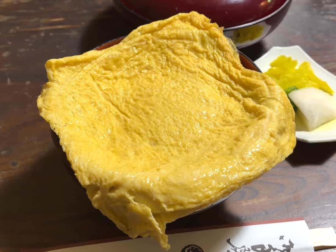 うなぎ丼の上に京風だし巻きがのったきんし丼。だし巻きが大きすぎて丼からはみ出ています。このビジュアルもいい。