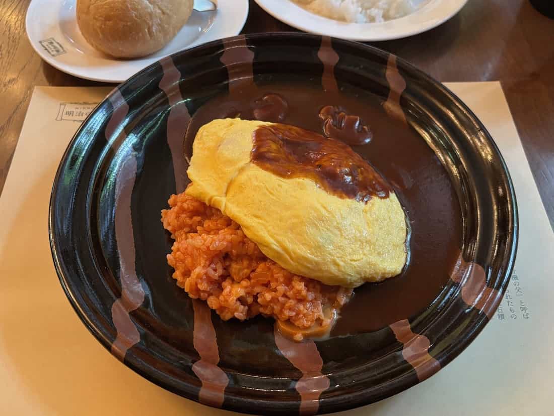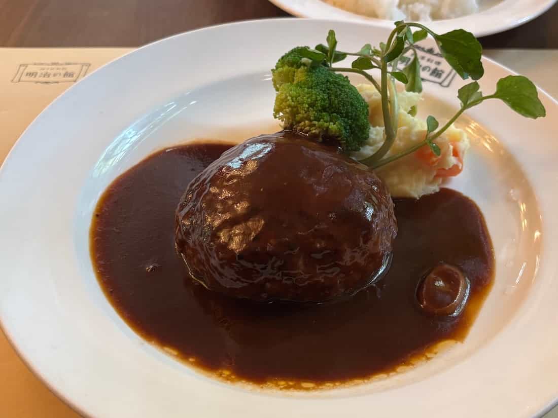明治の館ではオムレツライス、ハンバーグ、ビーフシチュー、パスタ、肉料理、魚料理などのメニューを楽しめます。