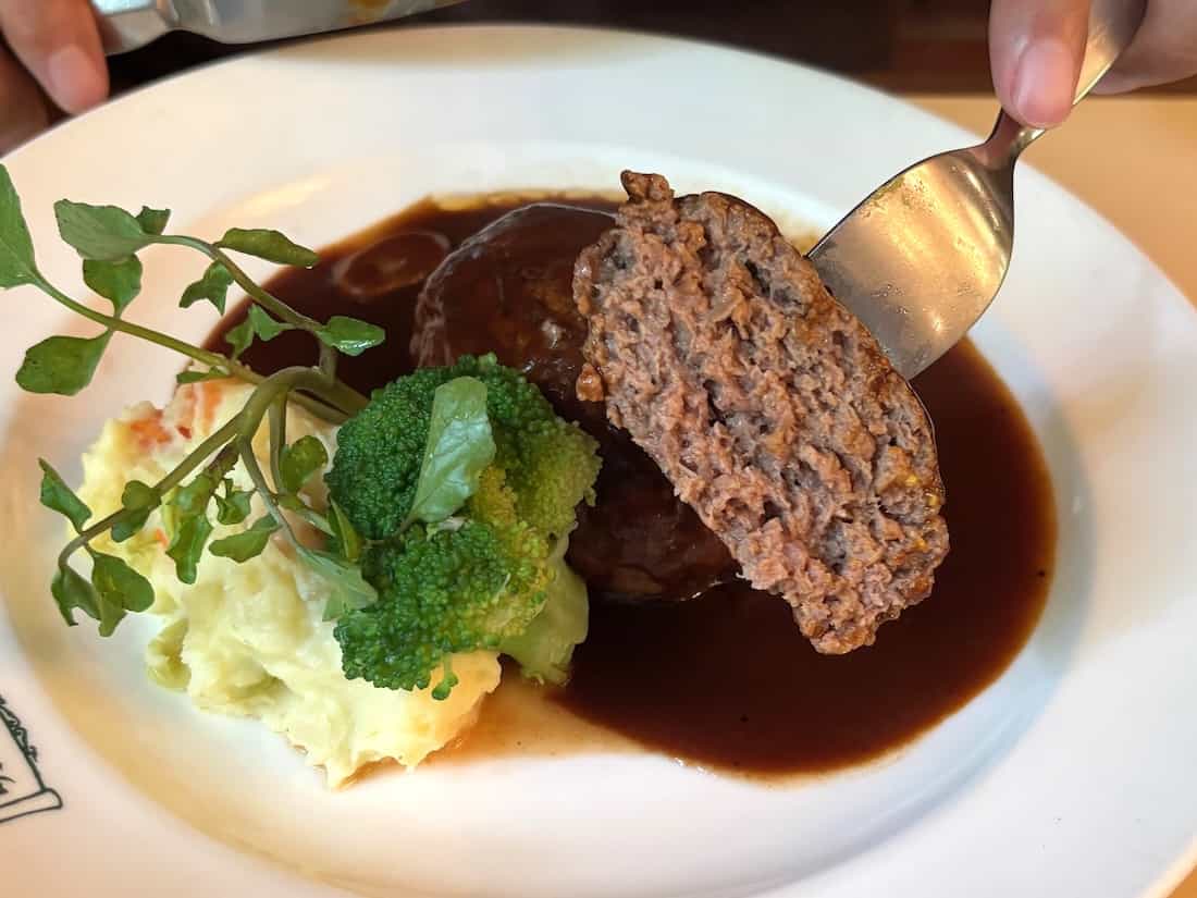 柔らかく焼き上げたハンバーグと濃厚デミグラスソースの相性抜群。ライスが止まらなくなる美味しさ。