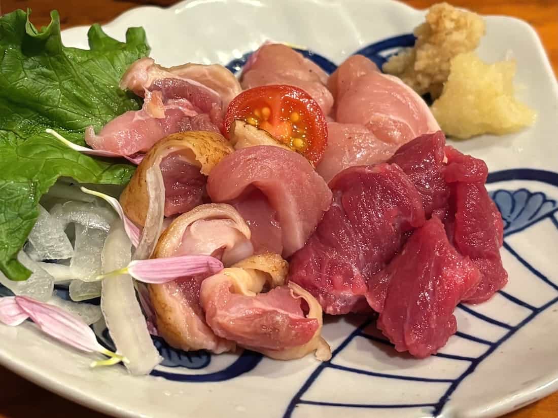 鶏たたき1375円。この日は鮮度の良い馬肉も入っているとのことで、馬刺しも入れてくれました。