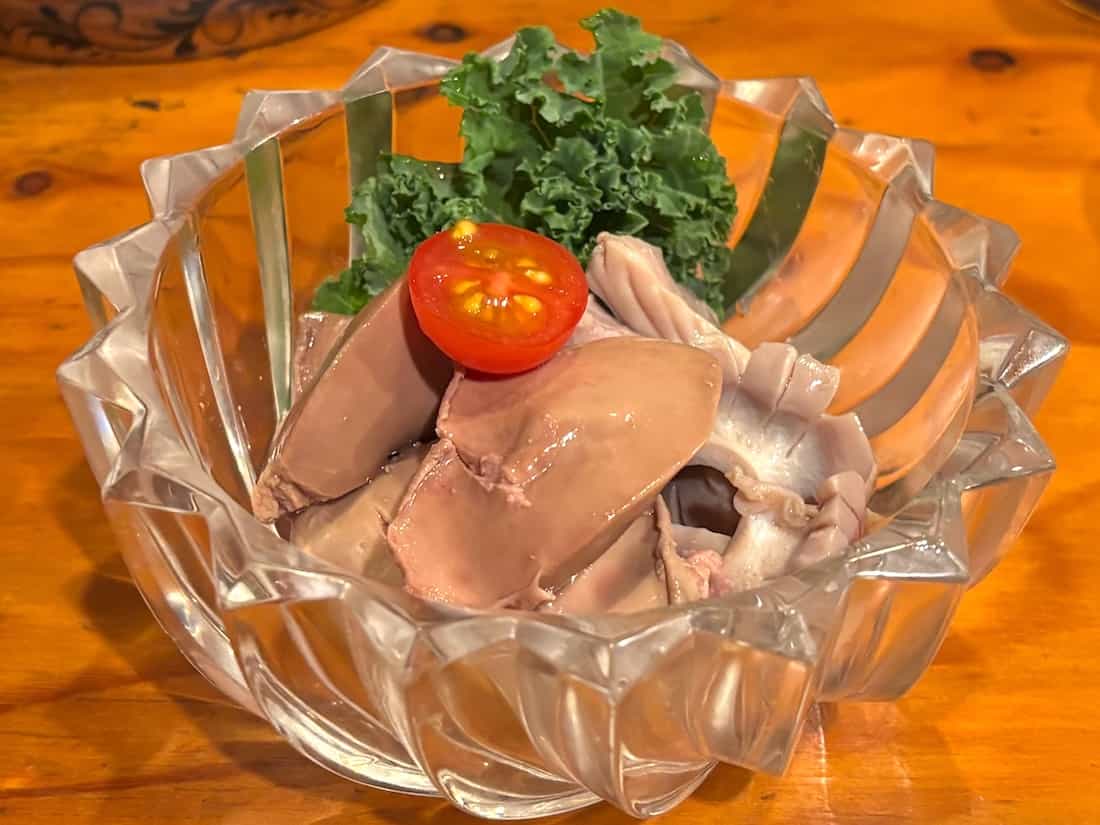 焼きではなく茹でた砂肝は初体験。茹でても砂肝特有のコリコリ食感があってびっくり。