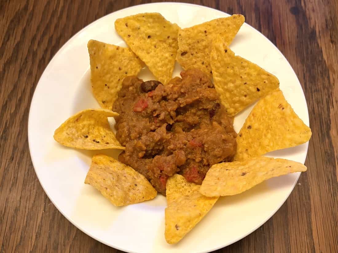 サクサク香ばしいタコスチップスにねっとりくるチリコンカルネを付けて。スパイシーでビールが進みまくる。