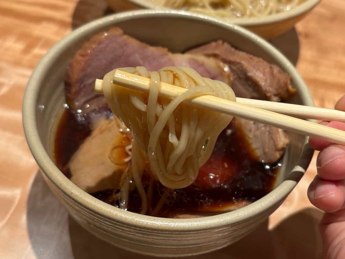 つけだれの中に分厚くてジューシーなチャーシューが2枚追加で入っています。