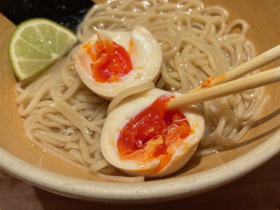 ⑥麺皿の鰹昆布出汁に柑橘を浸すことで、麺に伝わるほのかな香りと酸味を感じる。