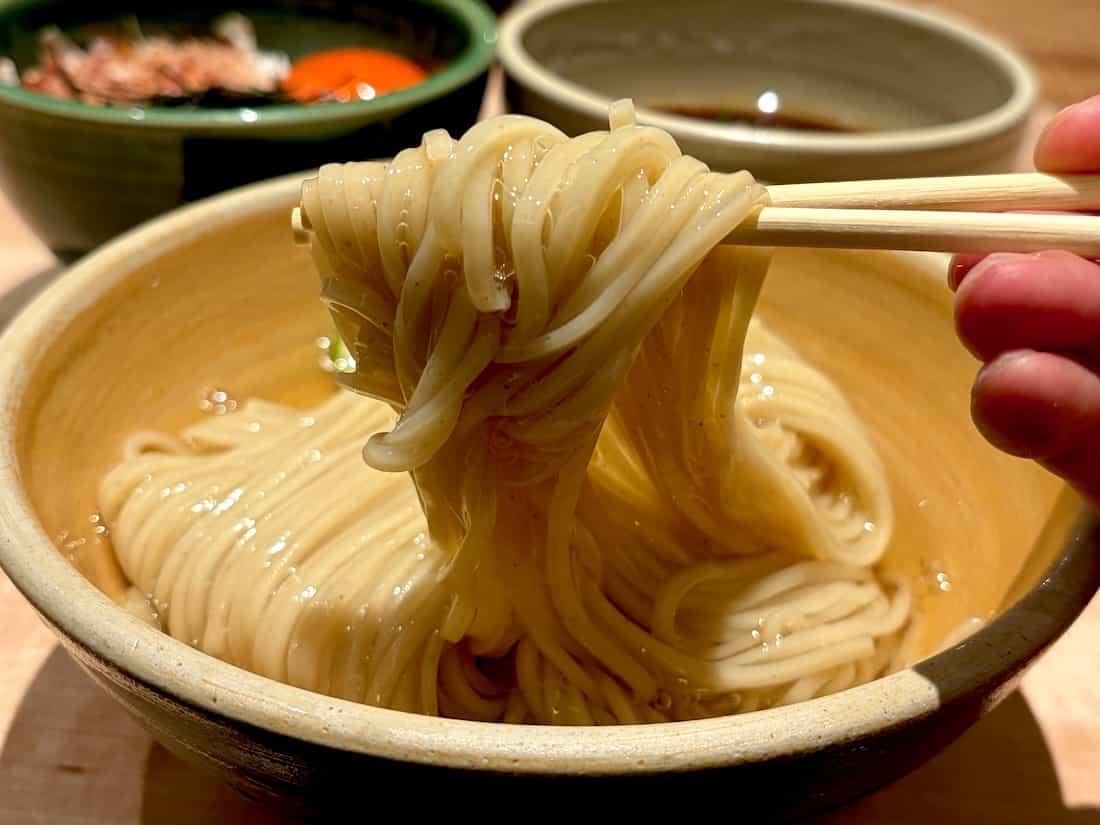 麺を持ち上げるとツルツルでとても長い。そのままひとくちズズっと食べると、小麦と鰹昆布出汁の優しい風味がふわっときます。