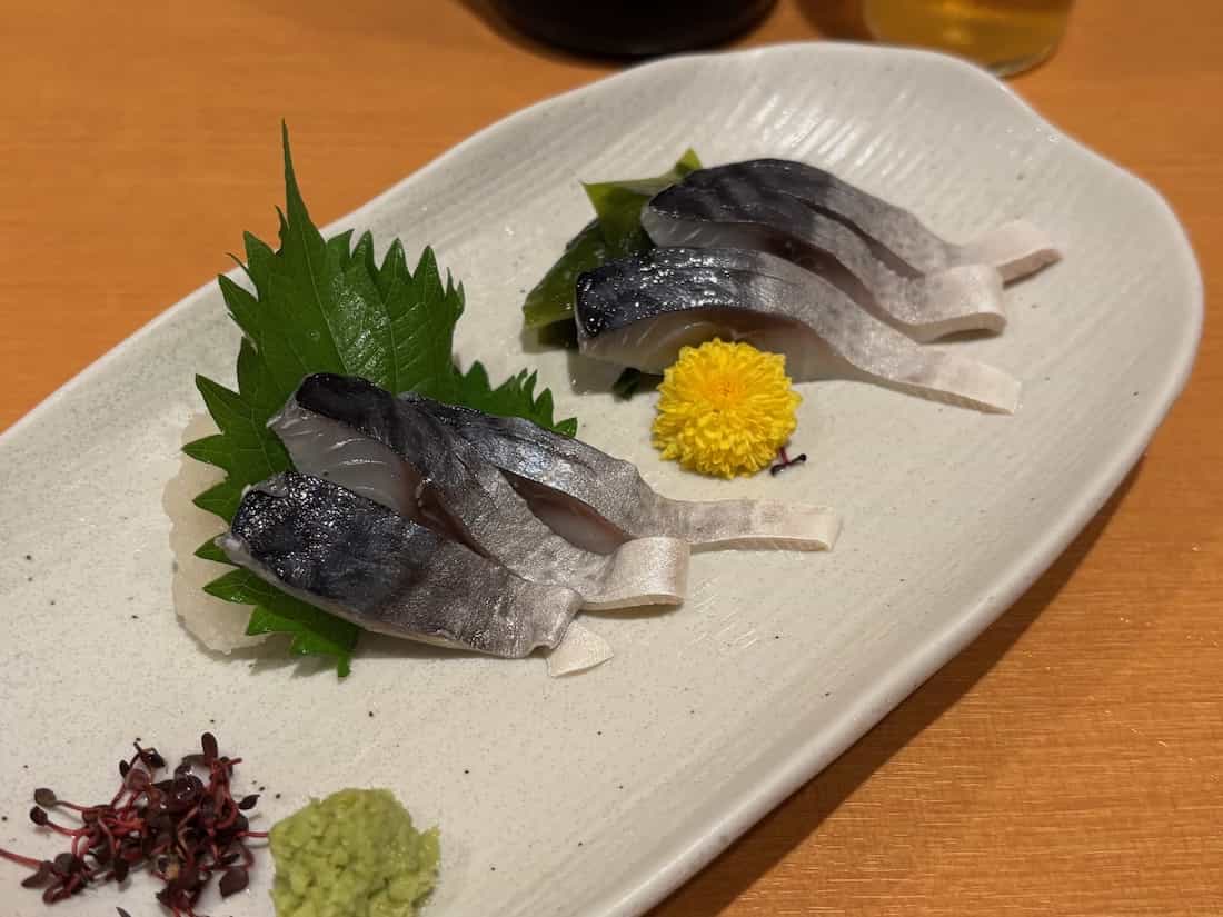 ジューシーで前菜にピッタリ。紅蓼(べにたで)まで添えてあるのが嬉しい。