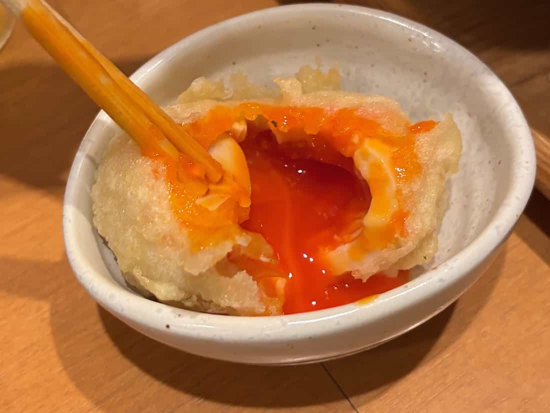 また揚げたての天ぷらも最高。特に肉厚でジューシーなかしわ天、オレンジ色が超鮮やかな半熟たまご天が印象的。