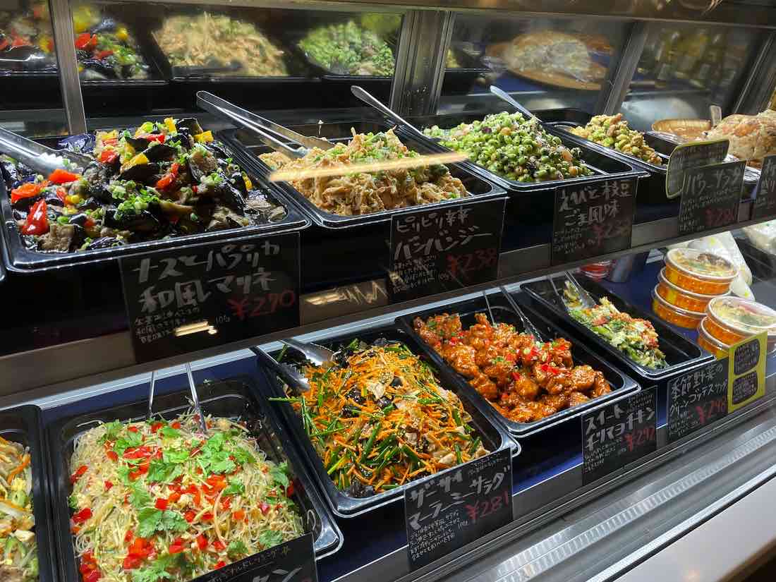 お惣菜のディスプレイ。シュリンプサラダ、ゴーヤチャンプルー、ハンバーグ、ポテトサラダなど、どれにしようか迷ってしまうほど美味しそうなものがズラリ。
